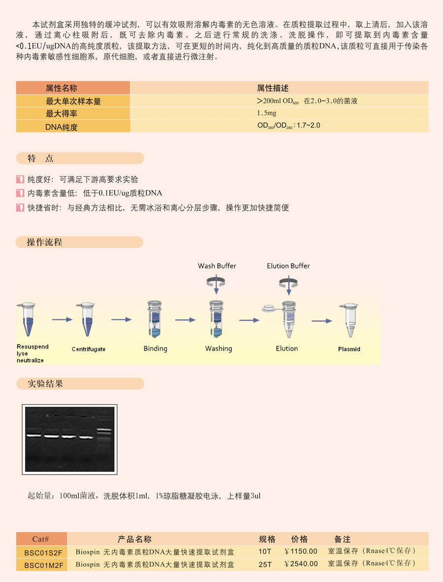 产品名 称:Biospin 无内毒素质粒DNA大量快速提取试剂盒