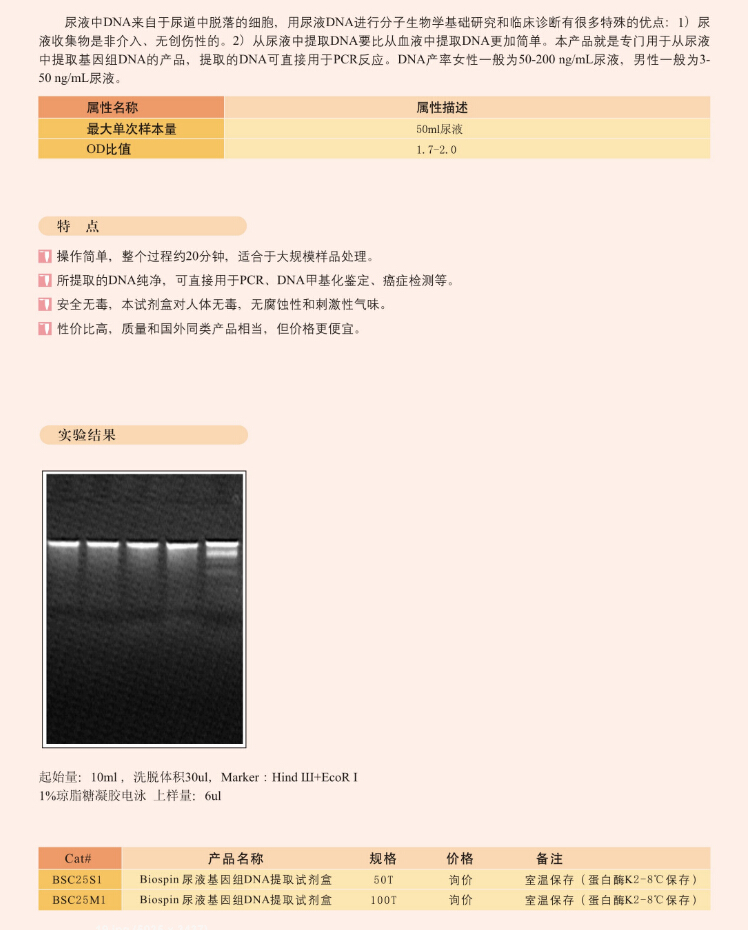 尿液中DNA来自于尿道中脱落的细胞,用尿液DNA进行分子生物学基础研究和临床诊断有很多特殊的优点:1)尿液收集物是非介入、无创伤性的。2)从尿液中提取DNA要比从血液中提取DNA更加简单。本产品就是专门用于从尿液中提取基因组DNA的产品,提取的DNA可直接用于PCR反应。DNA产率:女性一般为50-200ng/mL尿液,男性一般为3-50ng/mL尿液。