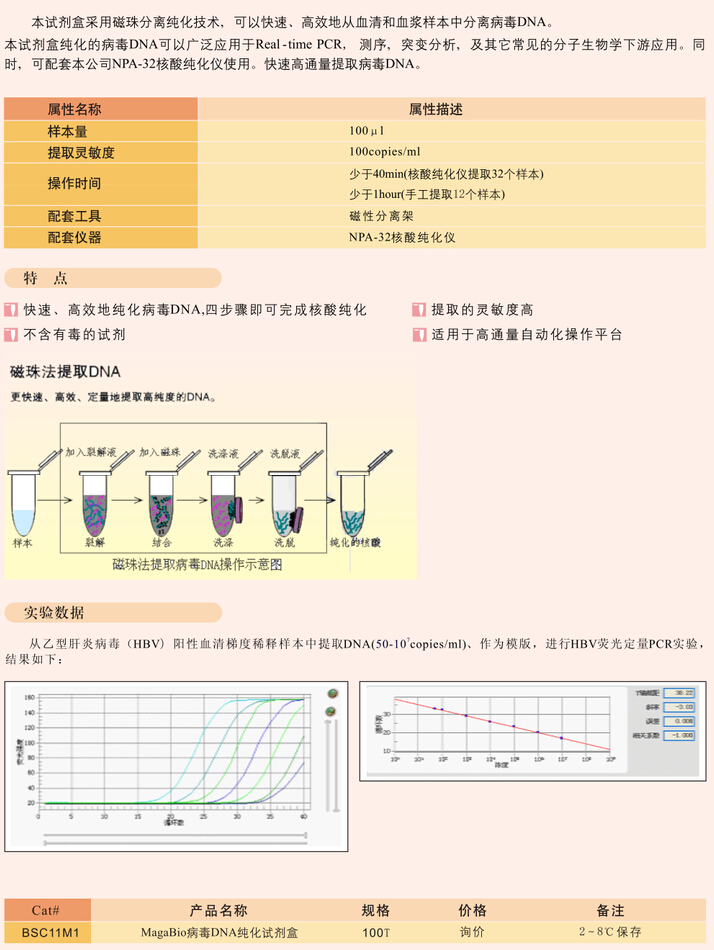 Magabio病毒DNA纯化试剂盒是一个简单,快速,有效分离高质量病毒DNA的产品,应用了先进的磁珠分离纯化技术。操作过程中无需离心、真空抽滤或柱分离,整个操作过程简单快速,可同时处理多个样品,高通量且重复性好,特别可用于微量样本的DNA提取。磁珠试剂盒提取的DNA可应用于如PCR,测序和杂交等下游分子生物学实验。 试剂盒适用于从血清或血浆中提取病毒DNA。