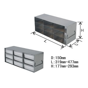 立式低温分隔架可存放纸盒、塑料盒和各种金属盒,由高品质的耐腐蚀不锈钢材料制成,设有手柄和识别卡插槽。该产品使实验样品的存取和管理更为有序,带抽屉的分隔架在推拉抽屉的同时,即可轻松存取实验样品,无须从冰箱中搬移整个分隔架。每个分隔架均有适合的安全锁定装置匹配。按照上图的示意,测量出您所使用冰箱的内部尺寸,通过这些尺寸,即可确定适合您立式冰箱的分隔架的高度(H)、长度(L)和宽度(W)。